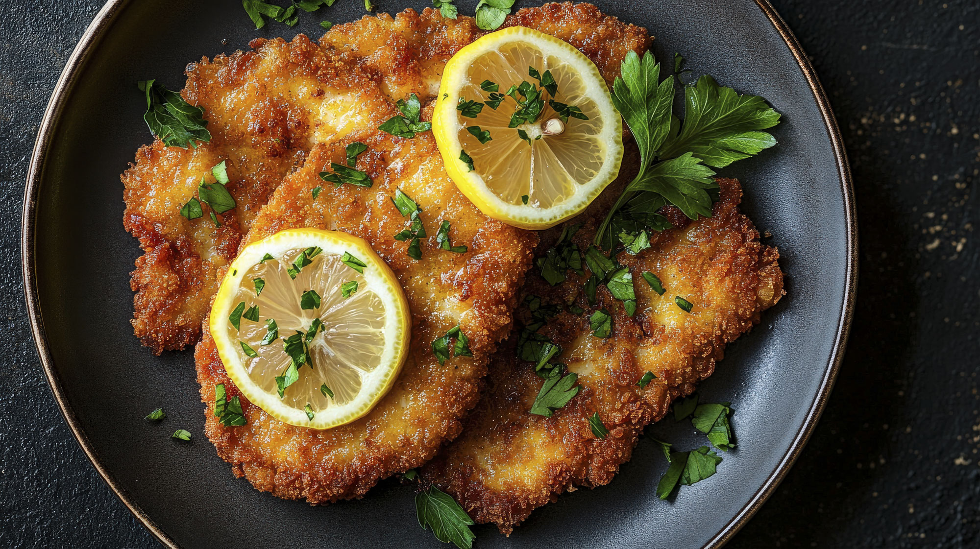 Schweineschnitzel aus dem Lummer, Portion Bratkartoffeln, Spiegelei, Schmorzwiebeln