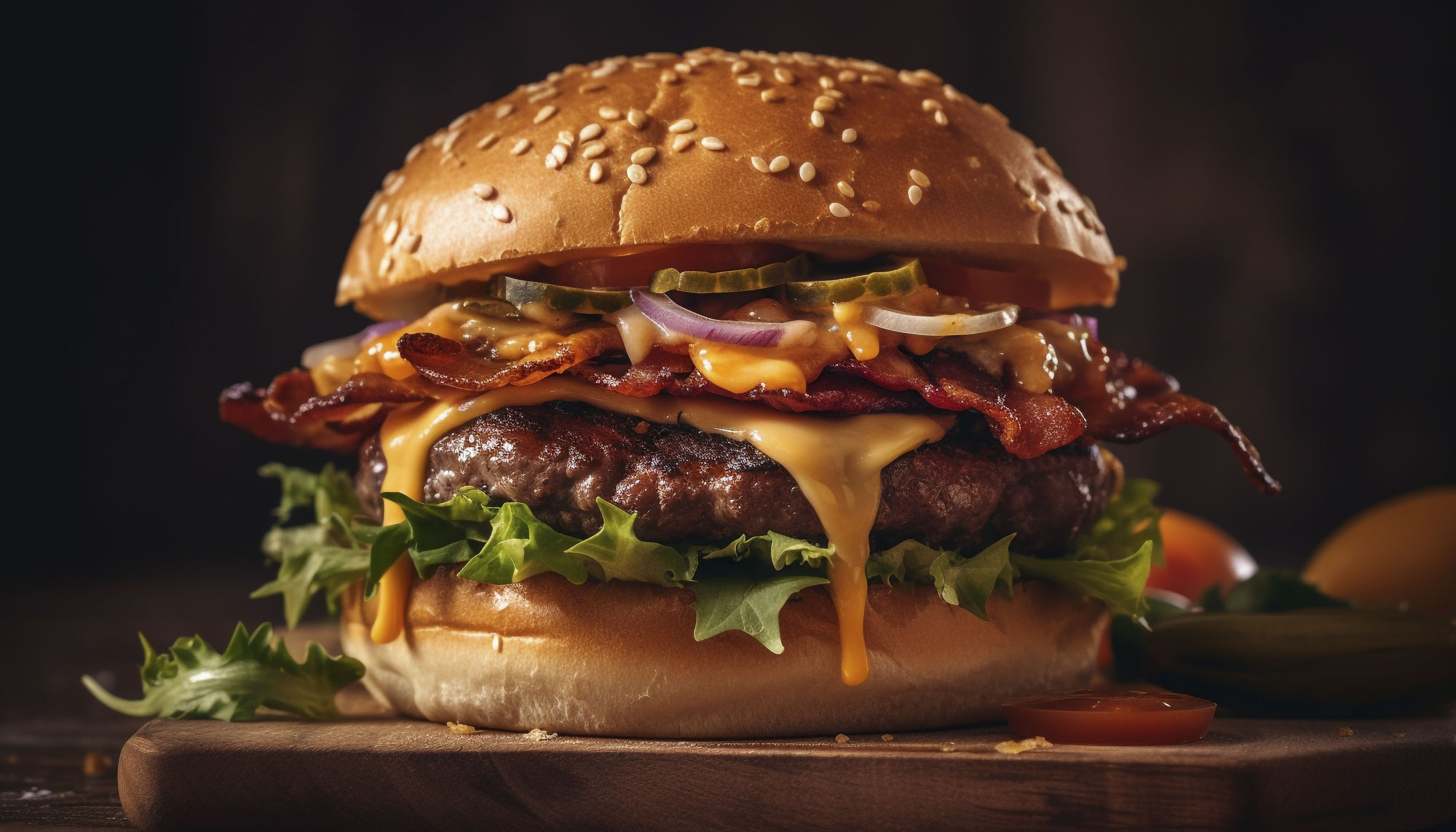 Bun, Rindfleisch-Patty, Bacon, Schmorzwiebeln, Soße, Käse, Portion Pommes