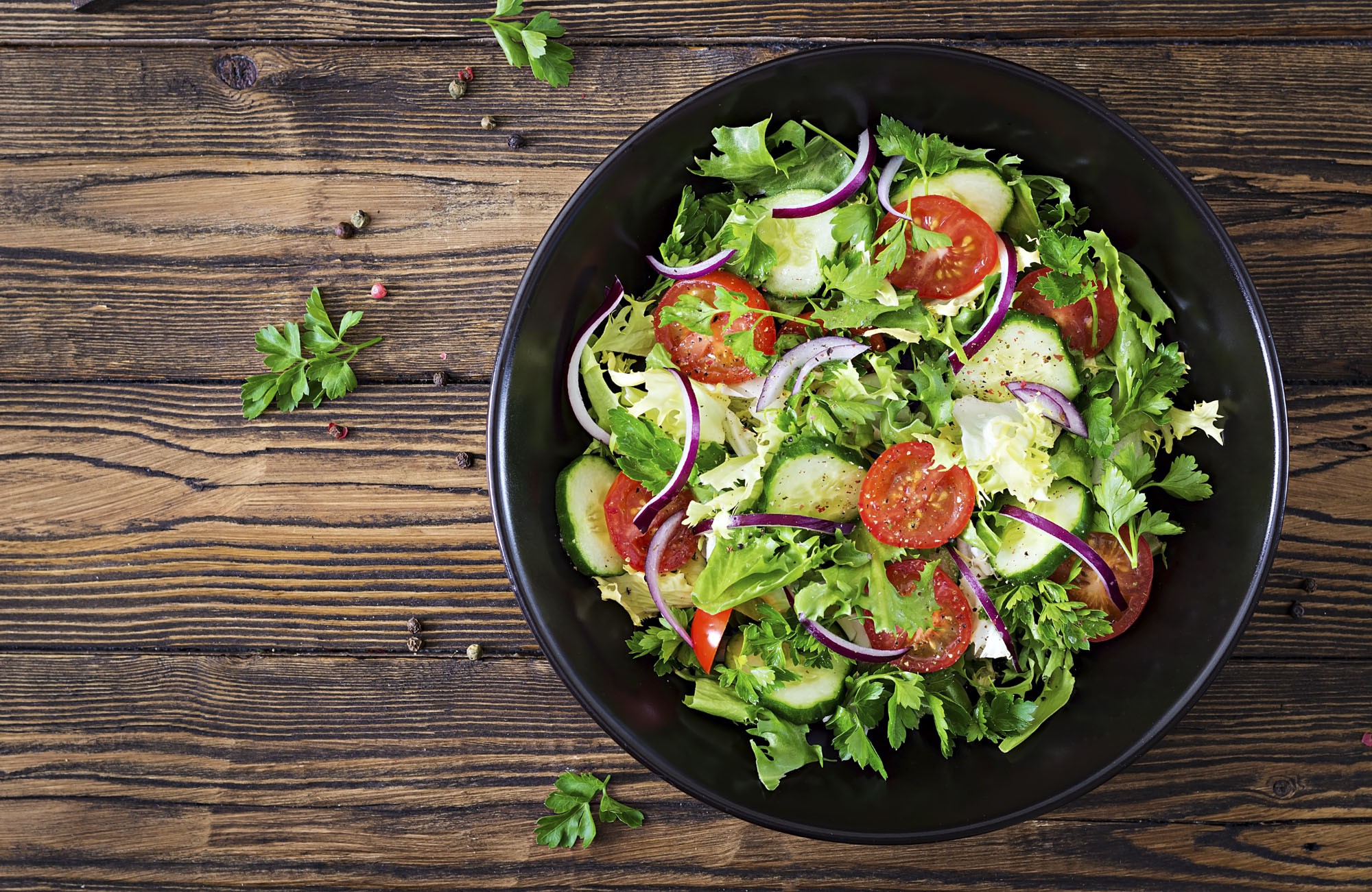 grüner Blattsalat, Gurke, Tomate, Paprika, Mais