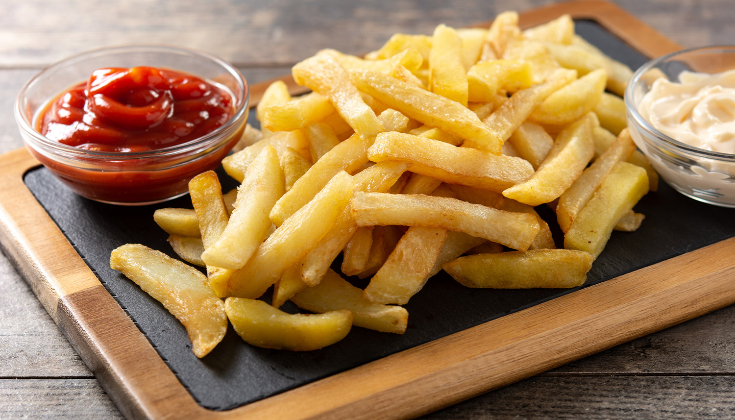 Bun, Rindfleisch-Patty, Bacon, Schmorzwiebeln, Salsa-Jalapeno Soße, Portion Pommes